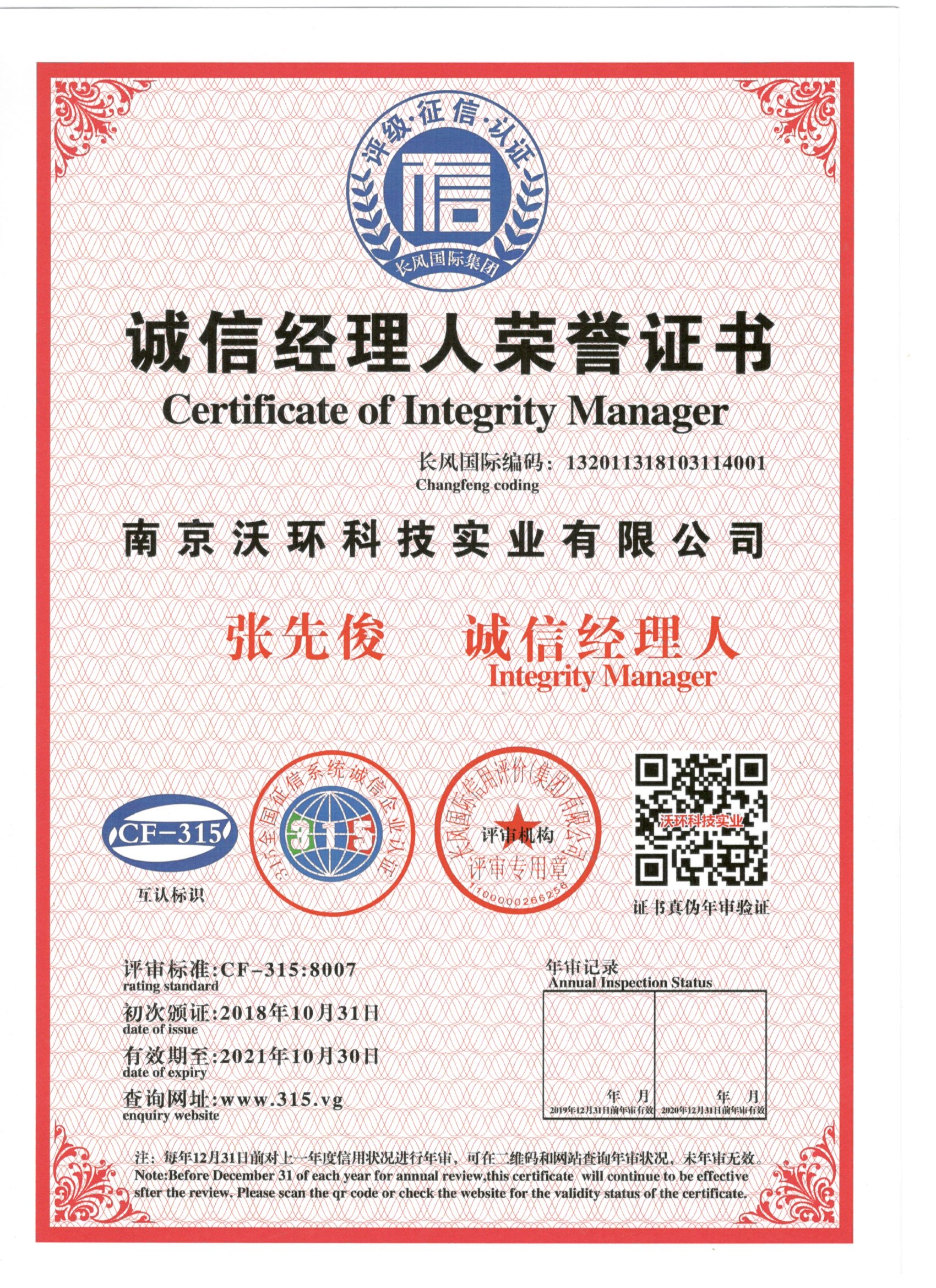 熱烈祝賀南京沃環(huán)公司張先俊先生被專業(yè)評審機構-長風國際集團評為誠信經理人,特發(fā)此證書