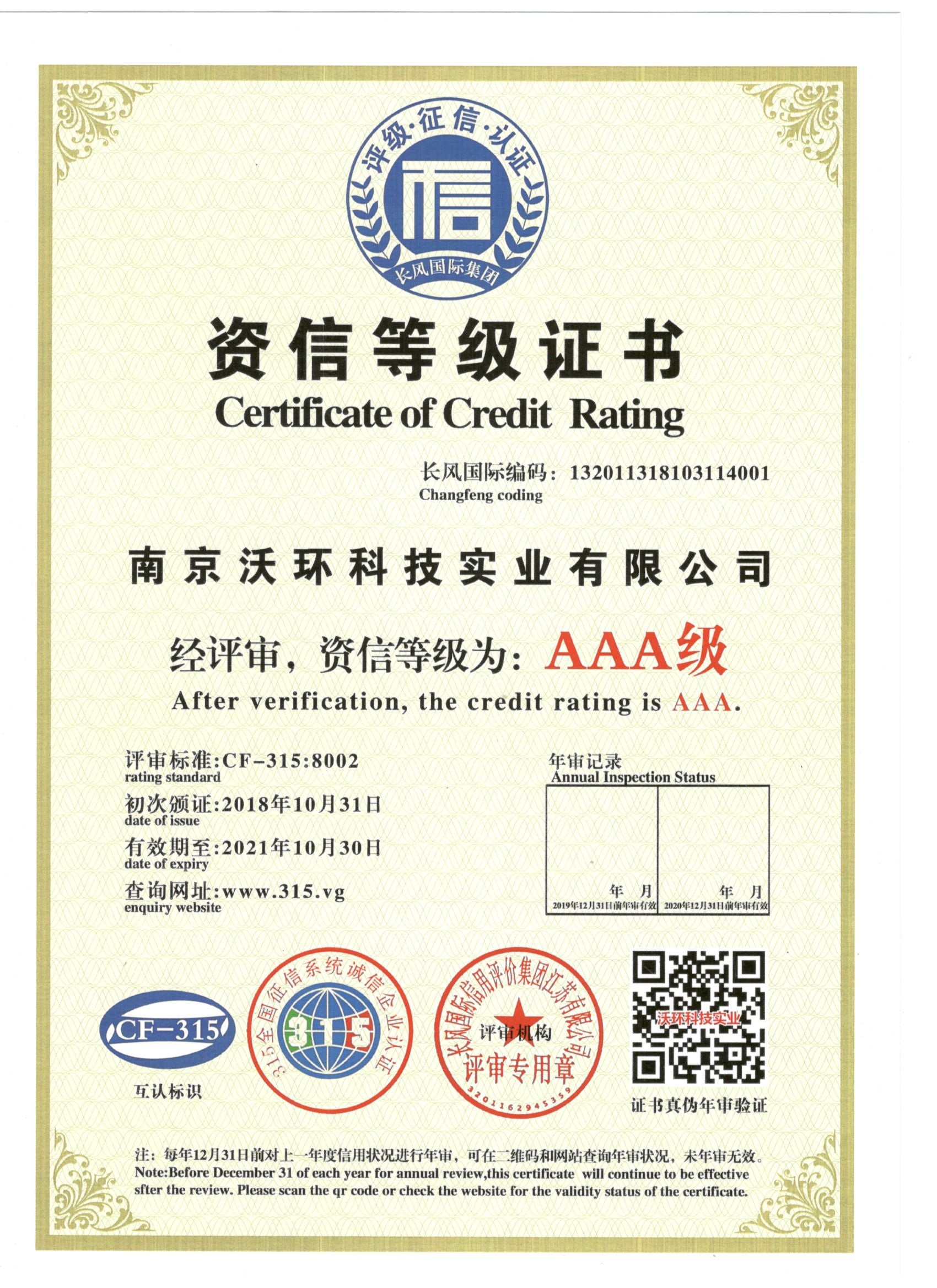 熱烈祝賀南京沃環(huán)公司被專業(yè)評審機(jī)構(gòu)-長風(fēng)國際集團(tuán)評為AAA級資信等級